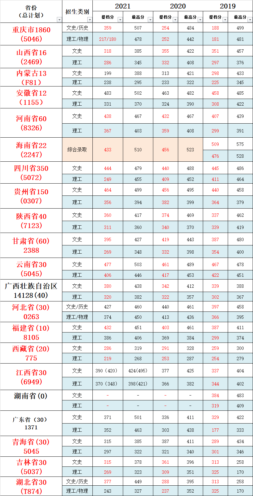 2019-2021年重庆财经职业学院分省份录取分数统计表(图)