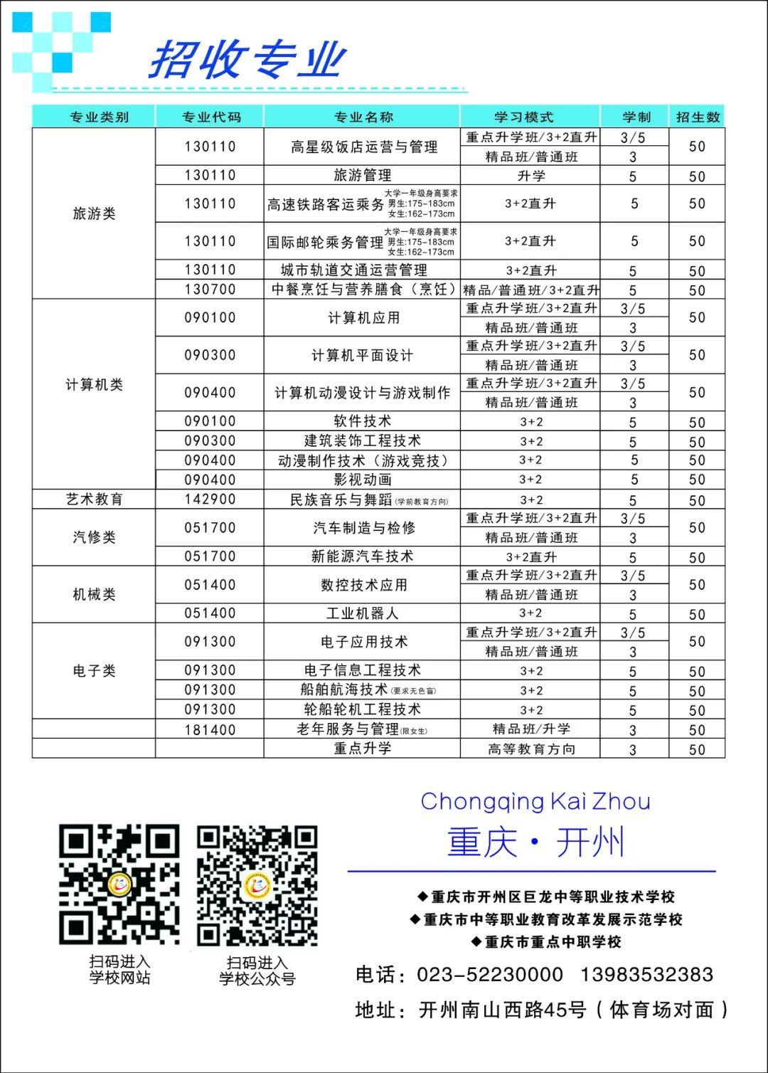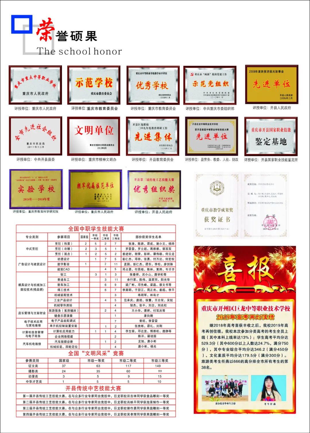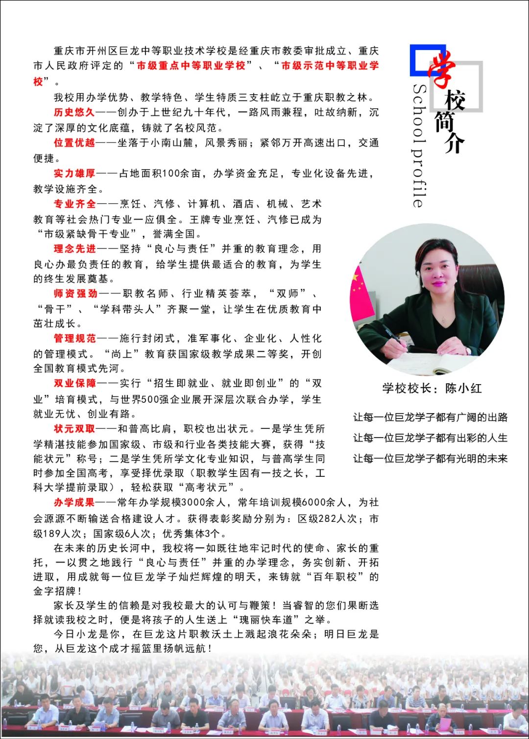 重庆市开州区巨龙中等职业技术学校是经重庆市教委审批成立、重庆市人民政府评定的“市级重点中等职业学校”、“市级示范中等职业学村 我校用办学优势、教学特色、学生特质三支柱屹立于重庆职教之林。