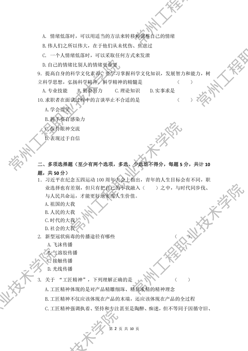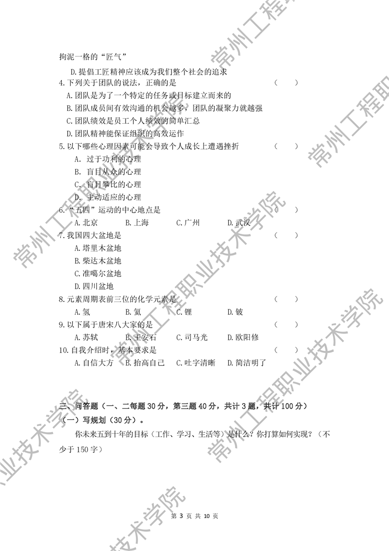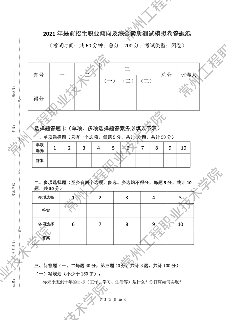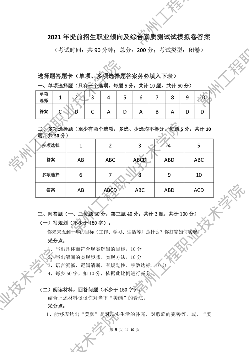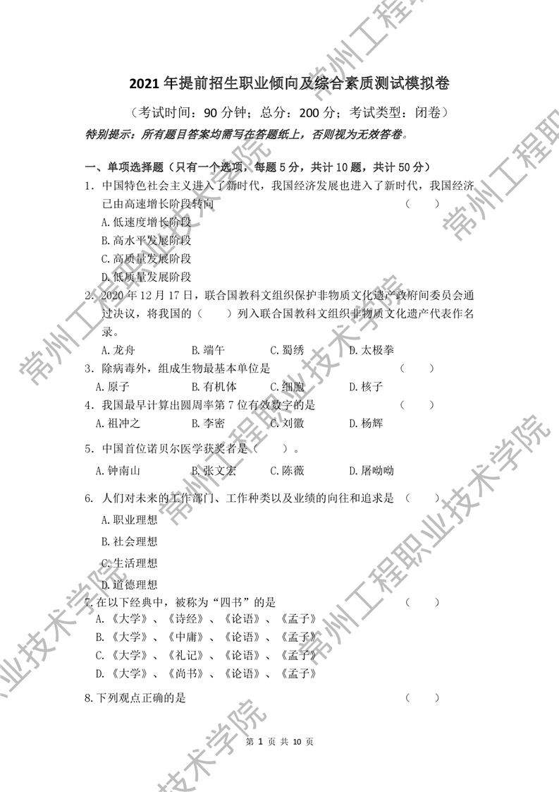2021年常州工程职业技术学院提前招生职业倾向及综合素质测试模拟卷及答案(图)