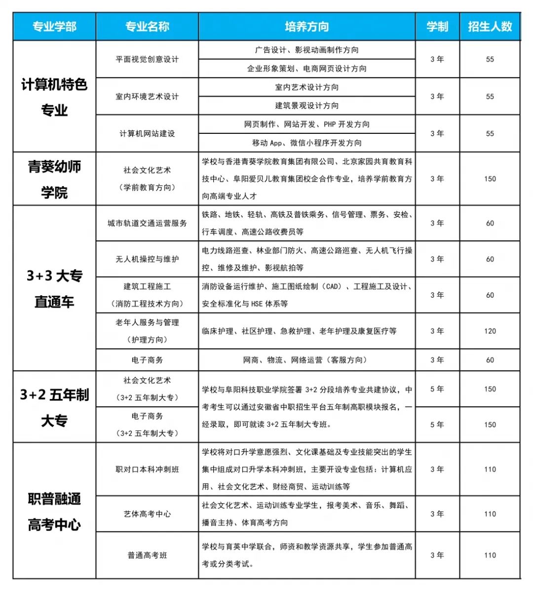 1、普通高考:阜阳计算机学校与阜阳市育英中学一校两牌,联合开办普通高考班,两校师资共享、教学同步,管理一体。为中考成绩在建档线上下50分左右,致力通过普通高考,考大学的你量身定制圆梦大学的立志成才方案。有美术、舞蹈、体育、音乐、播音主持特长的走艺术高考之路。