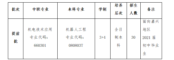 面向嘉兴地区2021届初中毕业生招收30人,嘉兴市中考总分75%以上者择优统一录取。第三年通过全省考核方可升入嘉兴学院,就读机器人工程专业本科,顺利完成大学考核即可取得全日制本科学历、工学学士学位。