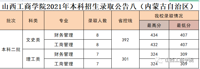 08山西工商学院2021年内蒙古自治区省本科普通批录取公告