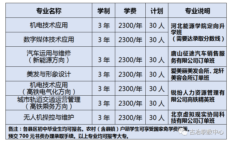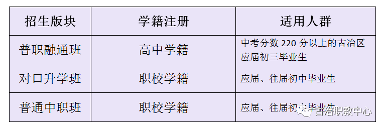 二、古冶职教中心招生三个板块:普职融通班、对口升学班、普通中职班。