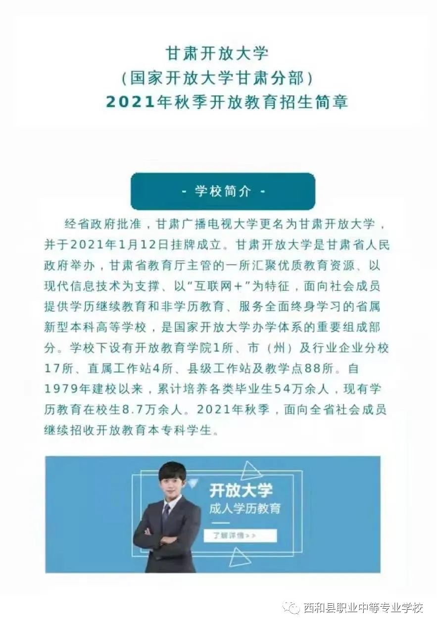 国家开放大学、兰大网院西和学习中心2021年秋季专、本科招生通知,欢迎社会各界在职人员、各行业学历需求者来电咨询。