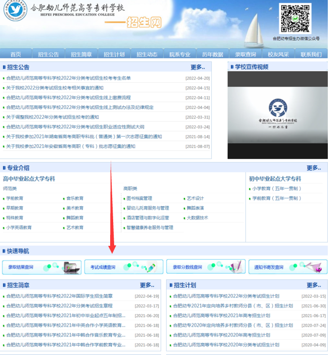 合肥幼儿师范高等专科学校2022年分类考试招生校考成绩查询系统已开通,考生可登陆我校招生网(https://zsb.***.cn/),通过“快速导航栏-考试成绩查询”板块进行成绩查询。