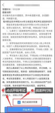2.点击考试按钮,阅读并同意考生承诺后进行打钩,点击“开始考试”;