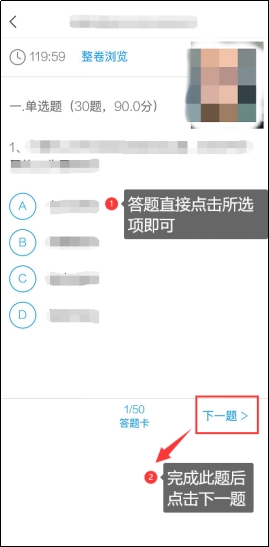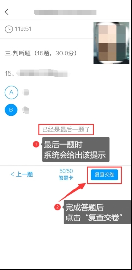4.开始答题并交卷:每题选择正确答案点击该选项即可,点击右下角“下一题”继续作答;到最后一题时系统会提示“已经是最后一题了”,可点击“复查交卷”进行答题情况核查。