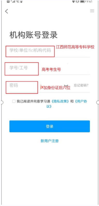 (1)选择“其他登录方式”,依次输入“江西师范高等专科学校”、账号(高考考生号)和密码(小写jx+身份证后6位,身份证号码中带字母“X”,统一大写“X”),点击登录。