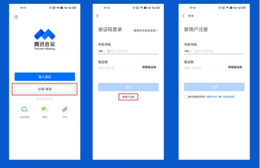 1、打开腾讯会议,点击“注册/登录”按钮,进入帐号密码登录页面,点击“新用户注册”进入注册页,根据要求填写对应的信息并完成注册,注册完成,注册完成后登录。