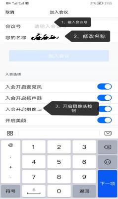 3、输入会议号加入会议,并调整录制角度。备注:会议号将由监考老师在考试前予以提供;名称需修改为:高考考生号+姓名;务必开启摄像头、麦克风按钮。