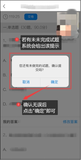 5.核查作答情况时,可修改选择答案;确认无误后,点击最上方的“交卷”按钮,并确认提交。(若存在未作答题目,系统会提示,请注意核查!)