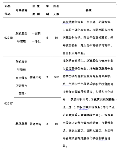 学校旅游类专业包括旅游服务与管理、高星级饭店运营与管理和航空服务等专业。其中旅游服务与管理专业开办于1996年,为浙江省优势特色专业、市示范专业、市品牌专业。与湖州职业技术学院合作开展中高职一体化人才培养模式。现有专任专业课教师9人,其中,高级教师3人,市教学能手1人,市教坛新秀1人,市级优秀德育工作者2人,湖州市金牌导游1人。